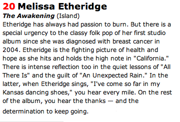 Nice mini-review in Rolling Stone of the album I recorded for Melissa Etheridge. It made several critics Top 10 lists. Fans are eagerly awaiting a full-fledged tour in the summer. But it’s an honor to be in the Top 50 for the year... much less #20!